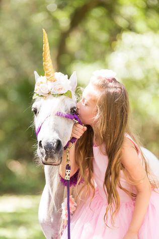Every little girl at one time or another has found themselves completely obsessed with Unicorns and truly wished they were real. We can keep that magic alive just a little longer while making dreams come true. Our enchanted Unicorn experience is so much fun for kids. It's a chance for girls ( and boys) to dress up in their fancy clothes, and meet a mythical horned horse that they only thought could only be real in fairy tales, oh and document the whole thing with beautiful pictures (for bragging rights) . Our Unicorn friends are calm , gentle spirits who love to meet children and take photos together. They may look like any other horse but if you truly believe that there is magic to be found in everyday life than you will see there is something very special about these white ponies.